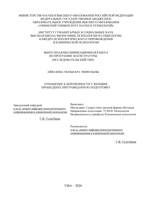 магистратура; ВКР; беременные женщины; прегравидарная подготовка; отношение к беременности; психопрофилактическая работа