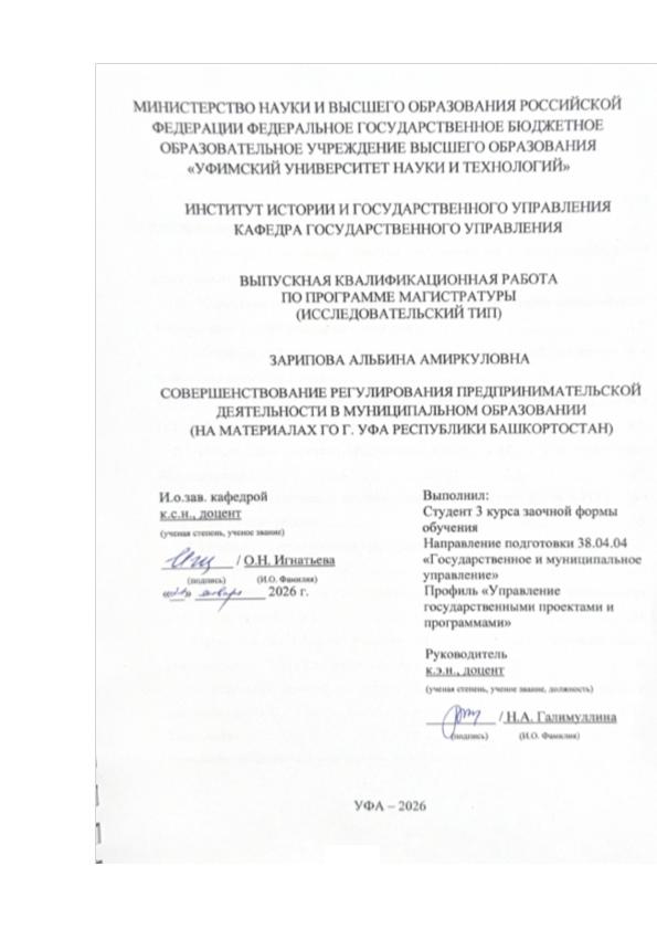 ВКР; магистратура; местное самоуправление; муниципальные образования; предпринимательская деятельность; муниципальное регулирование; Республика Башкортостан