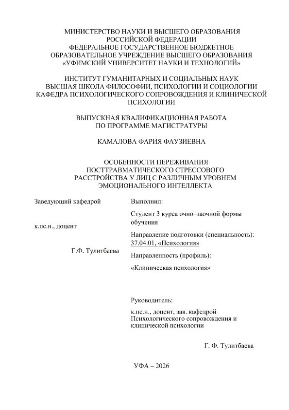 магистратура; ВКР; посттравматическое стрессовое расстройство; эмоциональный интеллект; методы психологической помощи; адаптация личности