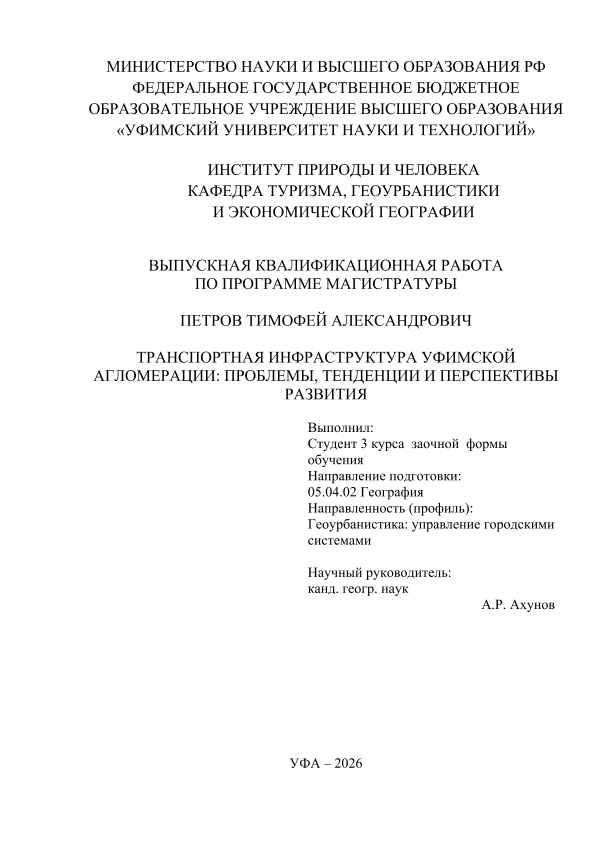 ВКР; магистратура; Уфимская агломерация; транспортная инфраструктура; функциональные зоны; транспортные магистрали; транспортные узлы; пассажиропоток; грузоперевозки