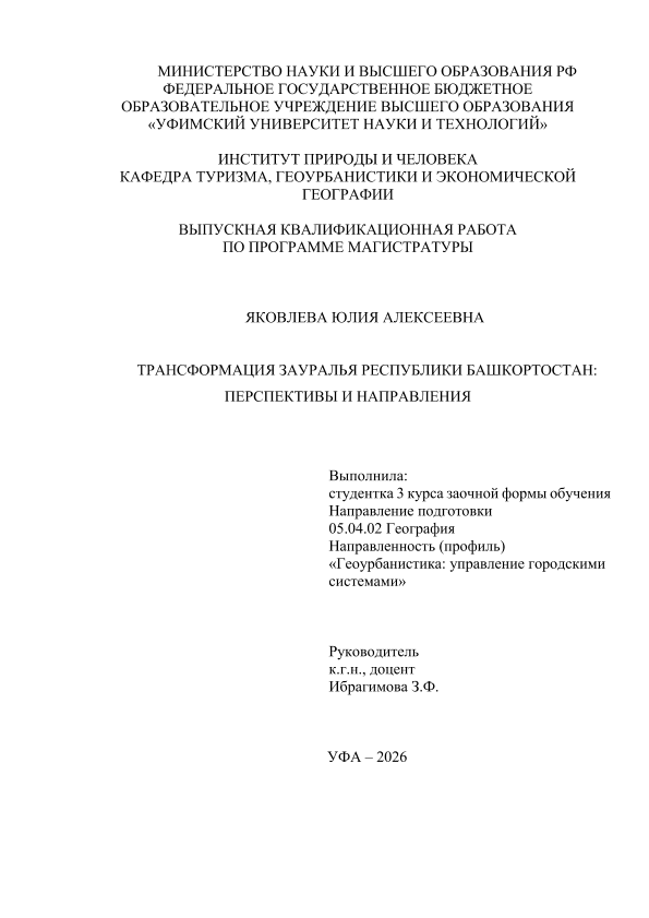 ВКР; магистратура; демографические процессы; рынок труда; социальная инфраструктура; промышленность; особые экономические зоны; туристический потенциал; Республика Башкортостан; Зауралье