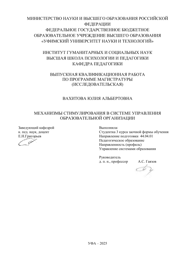 ВКР; магистратура; управление; образовательные организации; механизмы стимулирования; профессиональное развитие педагогов