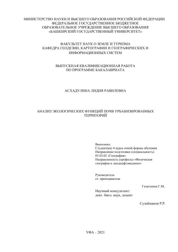 География — Ландшафтоведение; ВКР; бакалавриат; городские почвы; почвы урбанизированных территорий; экологические функции почв; функционирование экосистем; почвенный покров городов