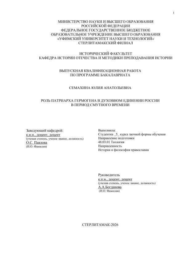 Православие; бакалавриат; ВКР; Смутное время; Гермоген