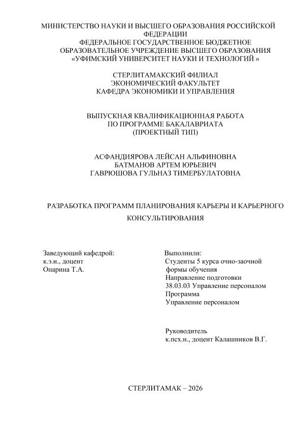 Управление персоналом; бакалавриат; ВКР проектного типа; карьера