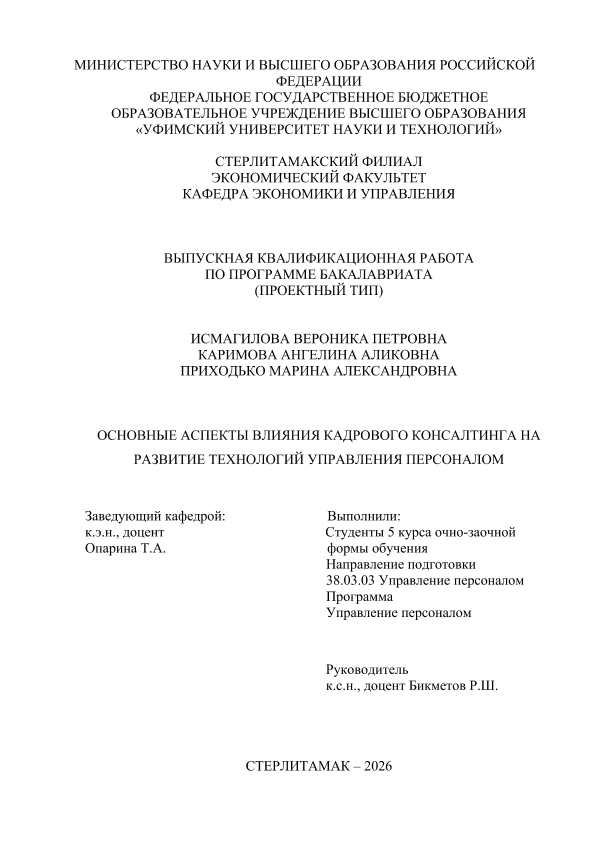 Управление персоналом; бакалавриат; ВКР проектного типа; кадровый консалтинг