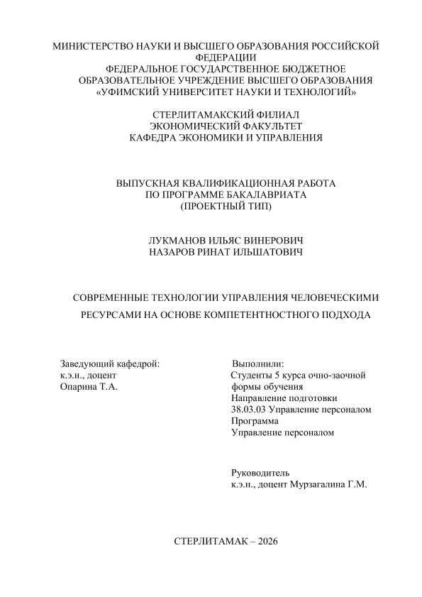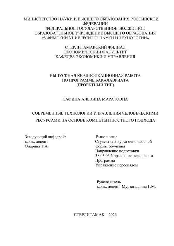 Управление персоналом; бакалавриат; ВКР проектного типа; компетентностный подход