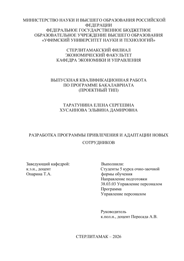 Управление персоналом; бакалавриат; ВКР проектного типа; адаптация новых сотрудников