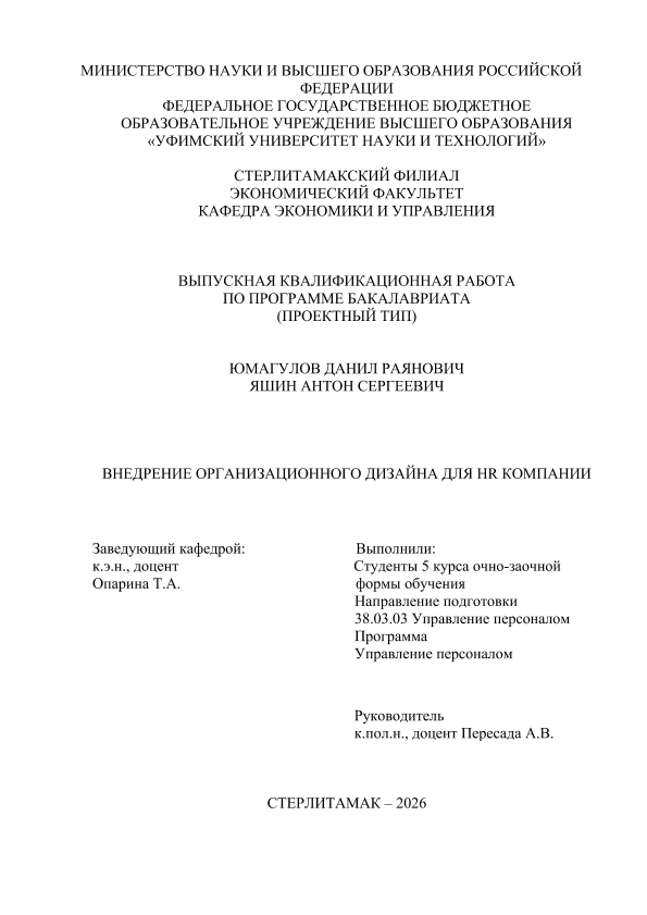 Управление персоналом; бакалавриат; ВКР проектного типа; организационный дизайн
