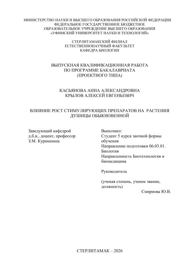Уфимский университет науки и технологий. Стерлитамакский филиал. Естественнонаучный факультет. кафедра биологии
