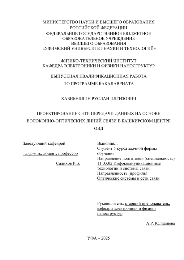 Subjects: бакалавриат; ВКР; волоконно-оптические линии связи (ВОЛС); волоконно-оптическая технология; Башкирский Центр ОВД; аппаратура ВОЛС; сеть передачи данных