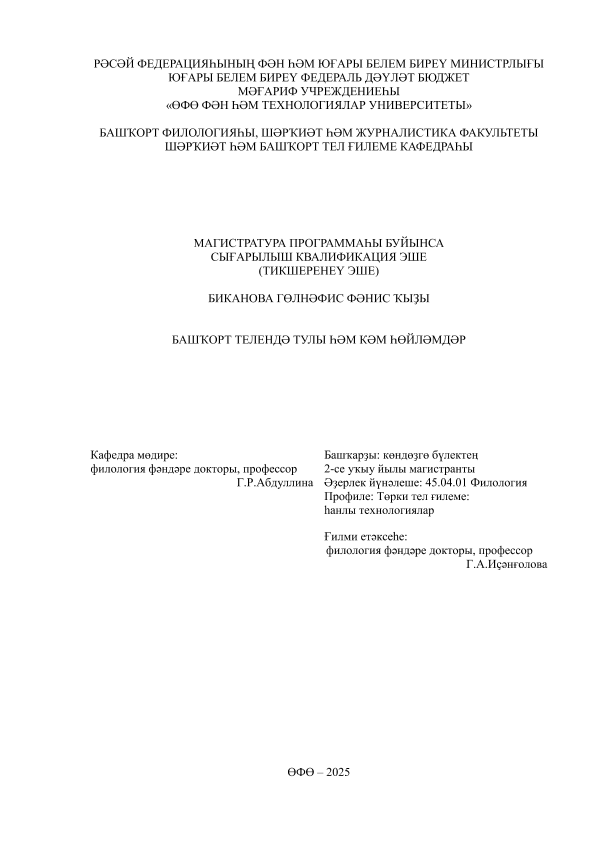 ВКР; магистратура; башкирский язык; полные предложения; коммуникативная единица синтаксиса; падежные предложения