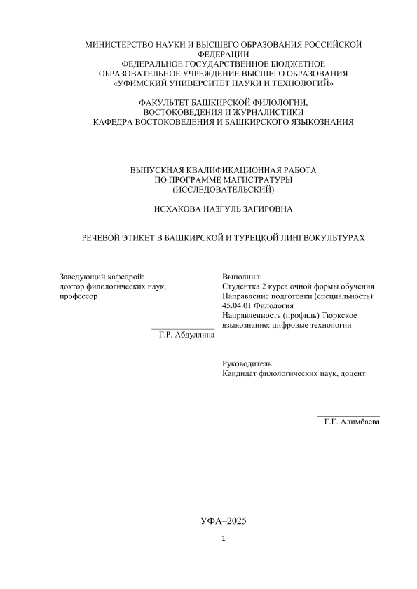 ВКР; магистратура; башкирский язык; лингвокультурология; язык; культура; речевой этикет; турецкий язык; сопоставительное исследование