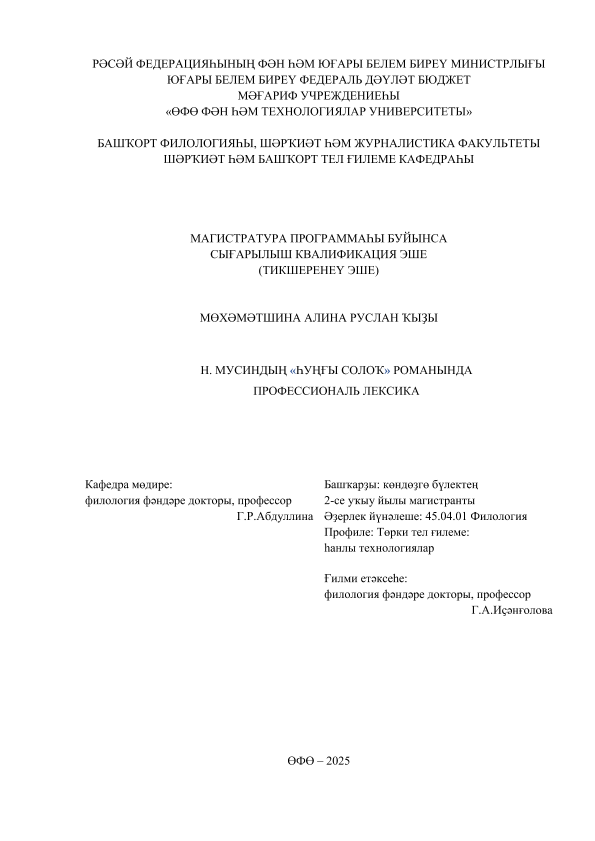 ВКР; магистратура; башкирский язык; лексикология; фитонимическая лексика; лингвокультурология; лексико-семантические группы