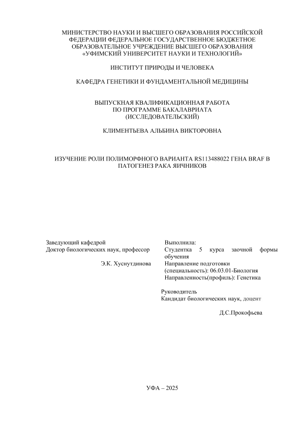 ВКР; бакалавриат; рак яичников; ген BRAF; ДНК; полимеразная цепная реакция