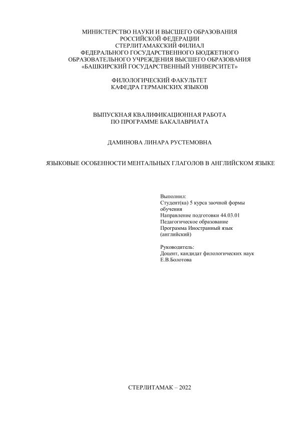 Педагогическое образование; Иностранный язык (английский); бакалавриат; ВКР; ментальные глаголы английского языка; семантика ментальных глаголов; лингвистическая наука