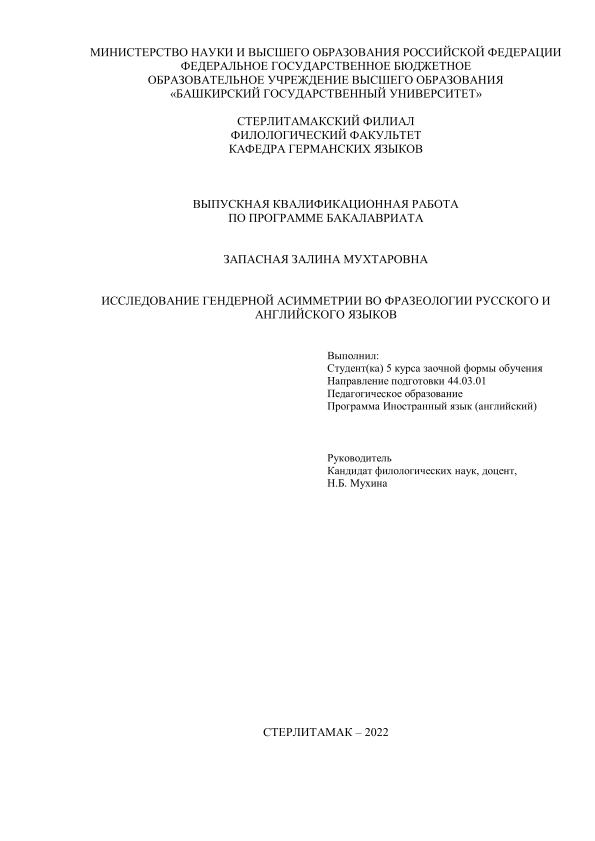 Педагогическое образование; Иностранный язык (английский); бакалавриат; ВКР; гендерная асимметрия; фразеология русского языка; фразеология английского языка