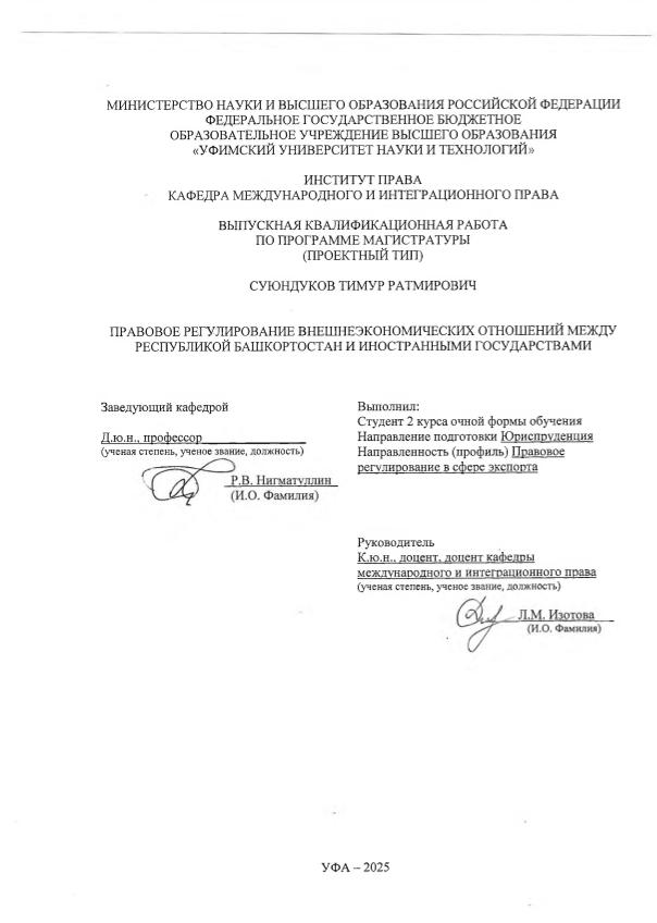 ВКР; магистратура; внешнеэкономическая деятельность; государственное регулирование; правовое регулирование; инвестиционная привлекательность; Республика Башкортостан
