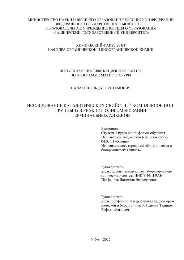 Химия — Органическая химия в целом; ВКР; магистратура; димеризация терминальных алкенов; ЯМР исследование реакции; исследование интермедитов; превращение олефинов