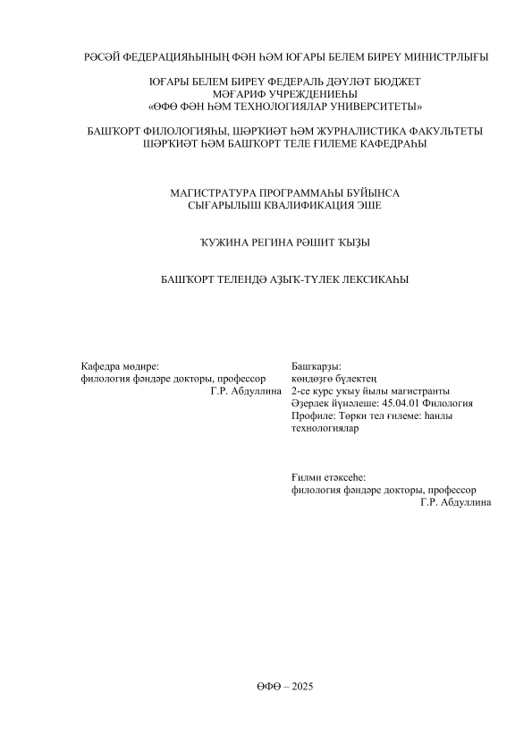 ВКР; магистратура; башкирский язык; лексика продуктов питания; языкознание; тематические группы пищевой лексике