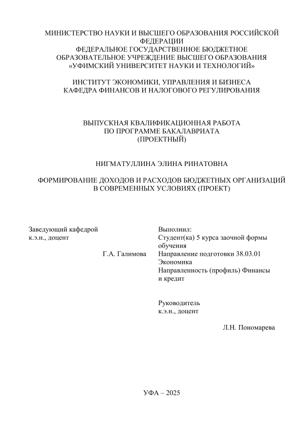 ВКР; бакалавриат; бюджетная организация; формирование расходов; анализ доходов; деятельность ФГБОУ ВО УУНиТ; финансирование образовательной сферы