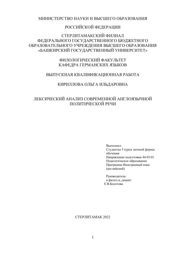 Педагогическое образование; Иностранный язык (английский); бакалавриат; ВКР; лексика политической речи; аутентичные политические речи; английский язык