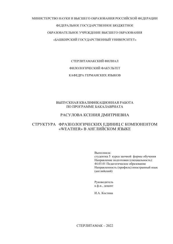 Педагогическое образование; Иностранный язык (английский); бакалавриат; ВКР; фразеологизм в лингвистике; английский язык; компонент «weather»