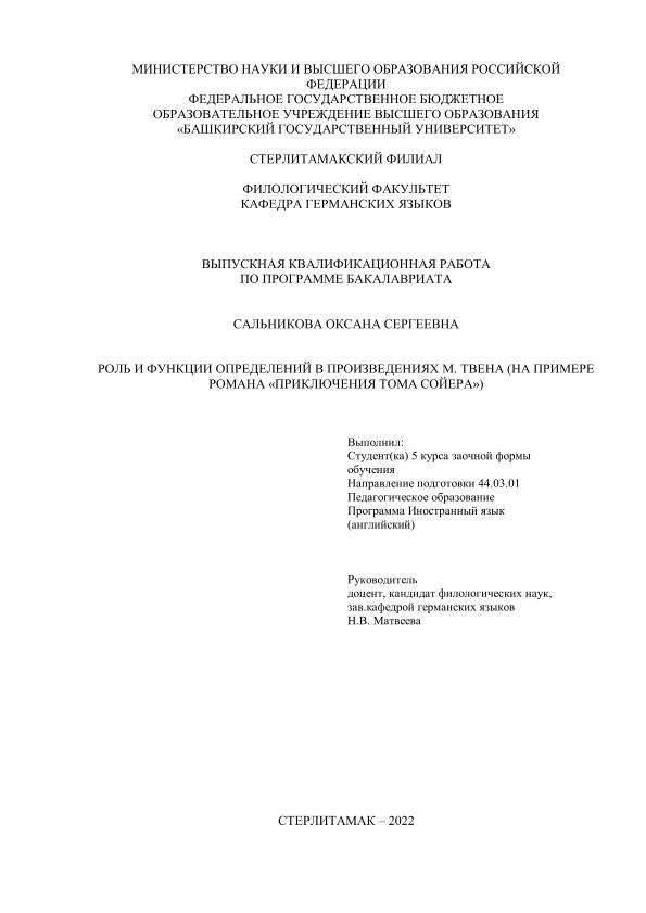 Педагогическое образование; Иностранный язык (английский); бакалавриат; ВКР; английский язык; виды определений; определения в произведении