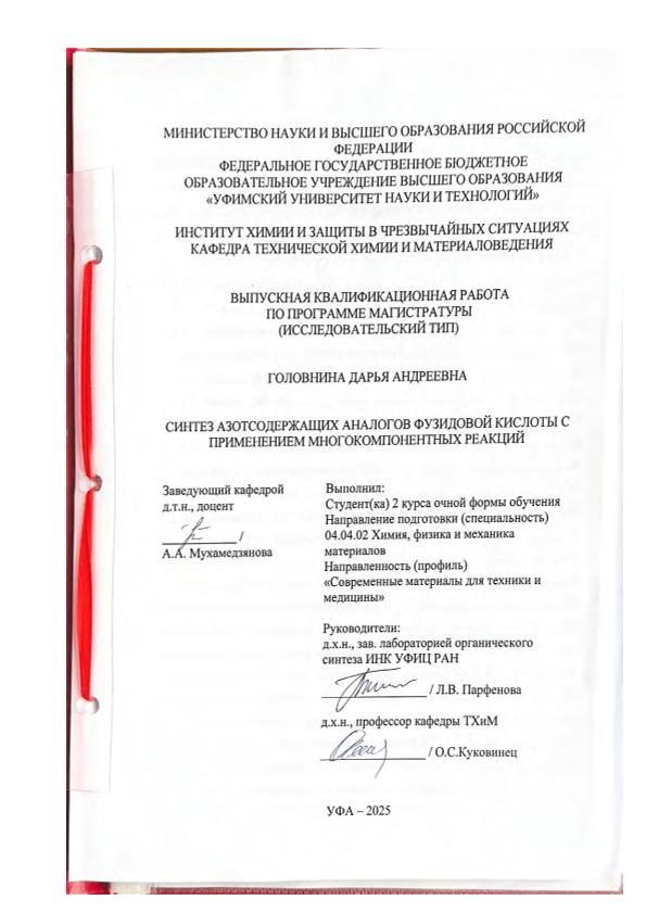 Subjects: ВКР; магистратура; фармакологические активные соединения; многокомпонентные реакции; фузидовая кислота; антибактериальные агенты
