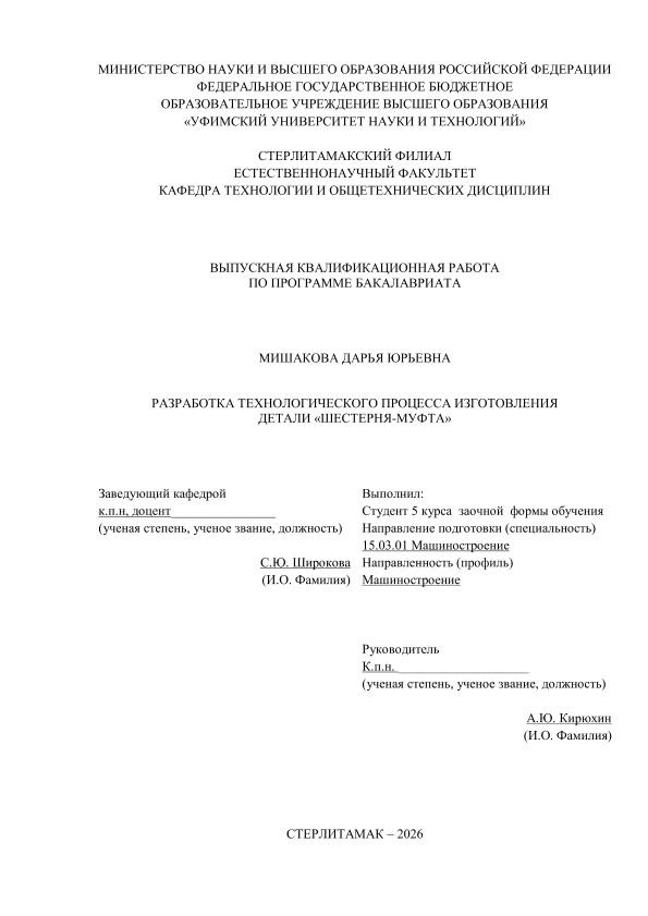 Техника; бакалавриат; ВКР; изготовление детали «Шестерня-муфта»