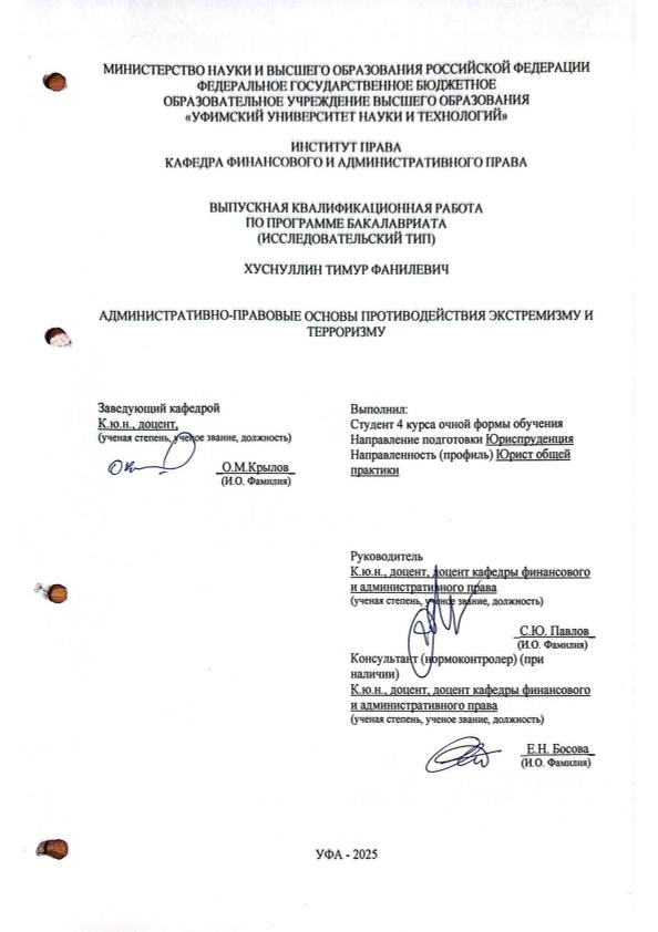 ВКР; бакалавриат; экстремизм; терроризм; административно-правовое регулирование; административная ответственность