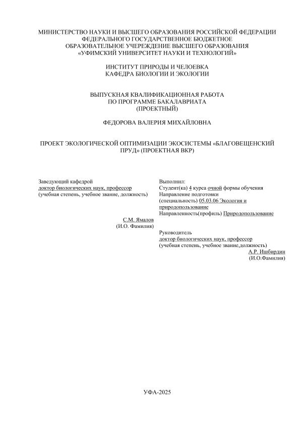 ВКР; бакалавриат; Уфимский район; водные ресурсы; малые озера; гидролого-экологическое состояние