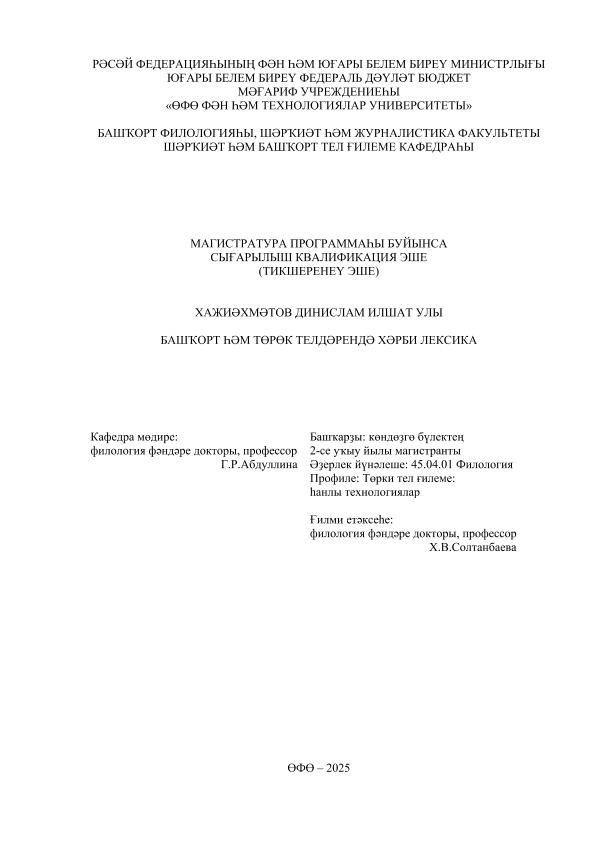 ВКР; магистратура; тюркское языкознание; военная лексика; башкирский язык; лексикология; этимологический анализ