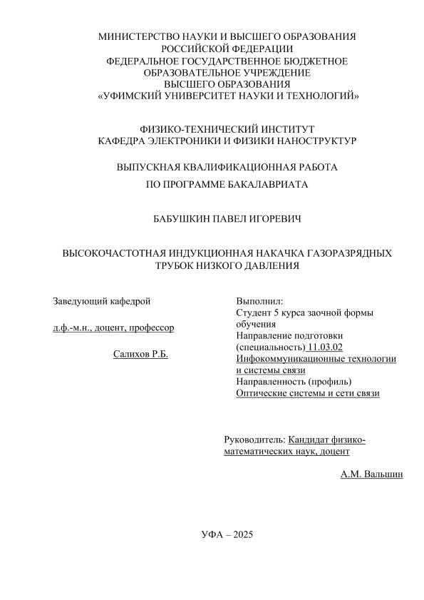 Радиоэлектроника — Электровакуумные приборы; ВКР; бакалавриат; газоразрядные лампы; высокочастотная индукционная накачка; газоразрядные лампы низкого давления