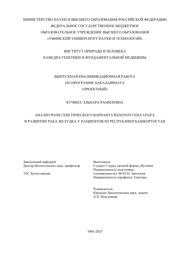 ВКР; бакалавриат; рак желудка; ген VEGFA; полиморфизм; генотипы