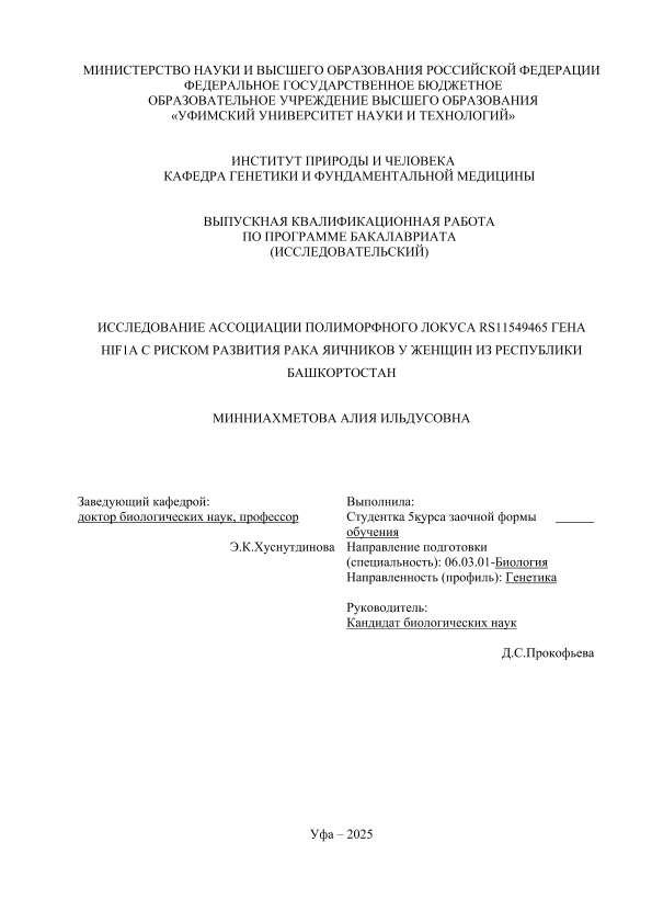 Subjects: ВКР; бакалавриат; рак яичников; ген HIF1A; полиморфизмы; полимеразная цепная реакция