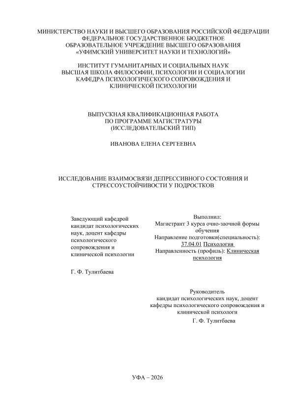 магистратура; ВКР; стрессоустойчивость; депрессивное состояние; психологические особенности подростков; копинг-стратегии