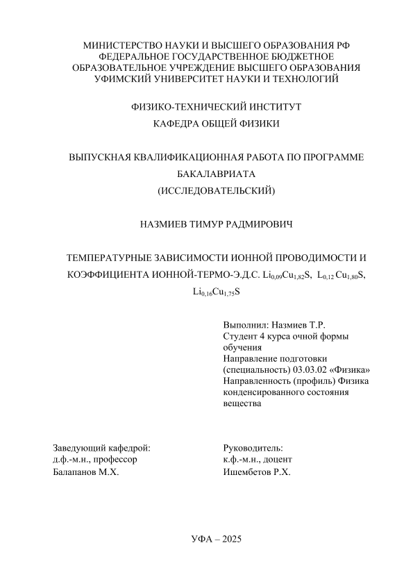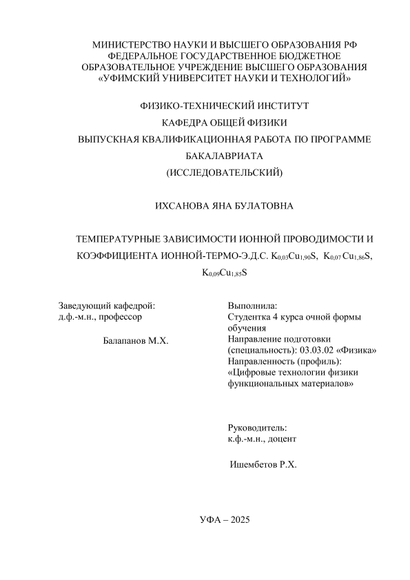 | Subjects: | Химия — Физическая химия в целом; ВКР; бакалавриат; ионная проводимость; суперионные проводники; халькогениды меди; полупроводниковые халькогениды; химическая диффузия в Cu2-хХ |