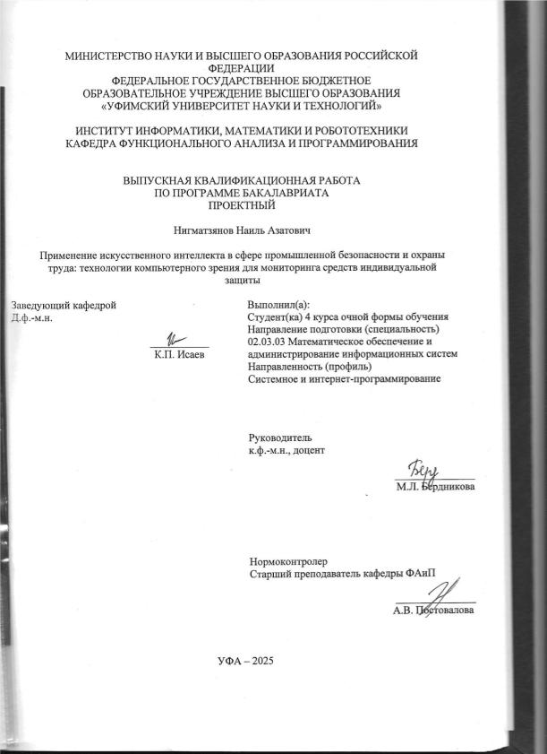 ВКР; бакалавриат; компьютерное зрение; YOLO; промышленная безопасность; средства индивидуальной защиты; автоматизированный мониторинг использования; программное приложение