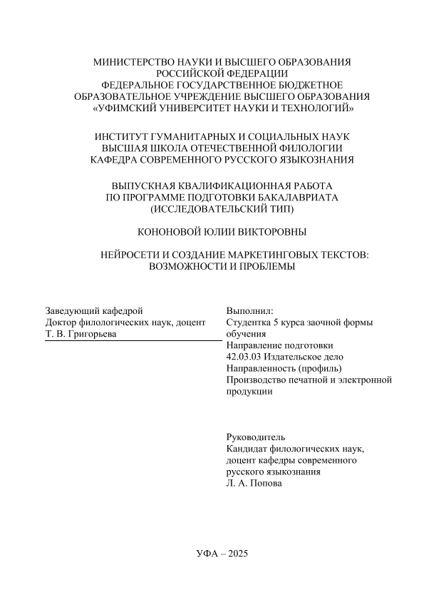 ВКР; бакалавриат; нейросети; маркетинговые коммуникации; текстовая генерация; лингвистические особенности