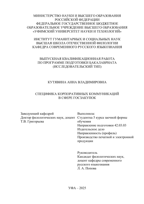 ВКР; бакалавриат; тексты корпоративных коммуникаций; сфера госзакупок; прагматические особенности; лингвистические особенности; языковое воздействие