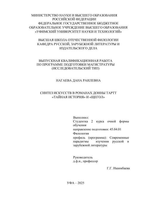 магистратура; ВКР; синтез искусства; литература; роман Донны Тартт «Щегол»; картины К. Фабрициуса; роман «Тайная история»; театр; эстетическая концепция