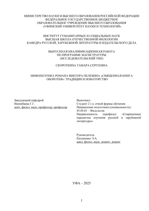 магистратура; ВКР; мифопоэтика; художественная литература; роман В. Пелевина «Священная книга оборотня»; постмодернизм; авторский неомиф