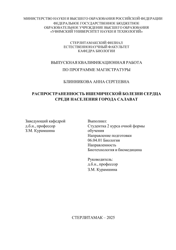 Медицина; магистратура; ВКР; ишемическая болезнь; сердечно-сосудистая система