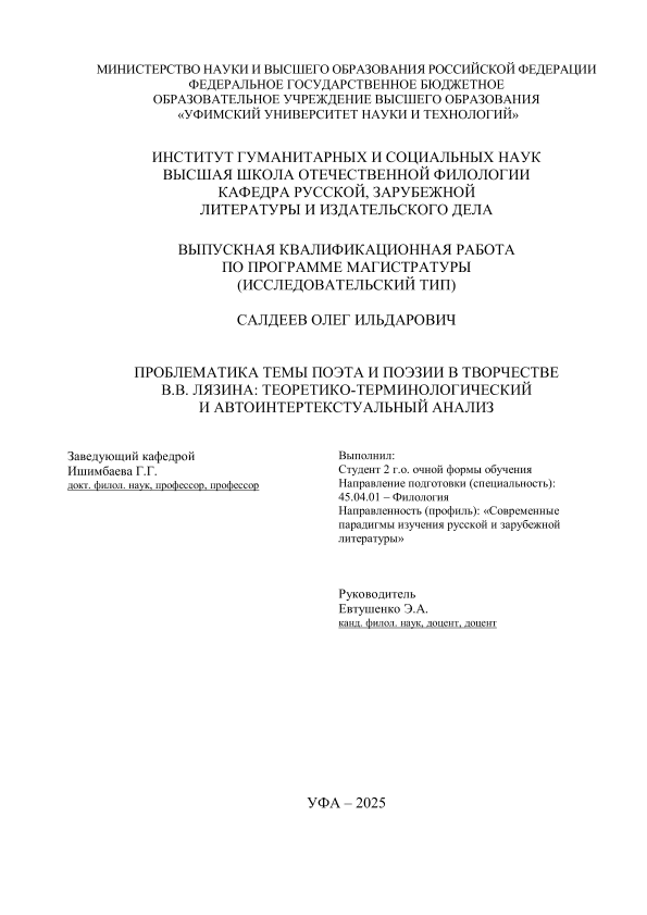 магистратура; ВКР; тематика; проблематика; поэзия; специфика автоинтертекстуальности; Лязин В.В.; темы поэта