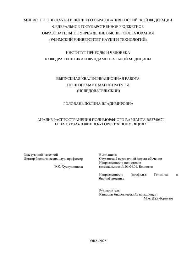 ВКР; магистратура; финно-угорские популяции; ген CYP3A4; полиморфизм; этногенез
