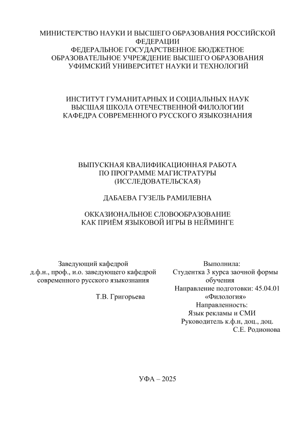 ВКР; магистратура; словообразование; языковая игра; лингвистика; окказионализм; создание неймов