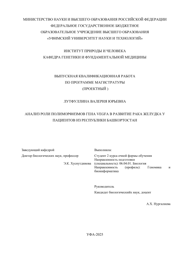 ВКР; магистратура; рак желудка; ген VEGFA; язвенная болезнь; полиморфизм