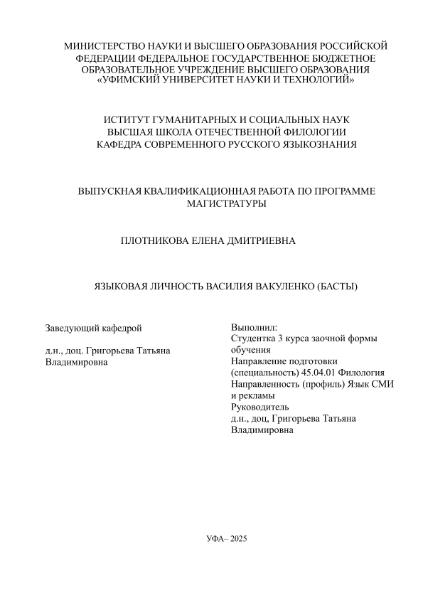 ВКР; магистратура; анализ языковой личности; Баста; тексты песен; шоу «Вопрос ребром»; интервью; лингвистические средства