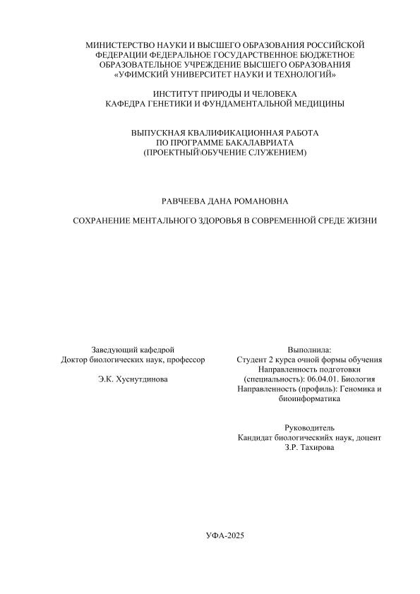 ВКР; магистратура; ментальное здоровье; когнитивные способности; пространственный интеллект; ген eNOS; ген MTHFR